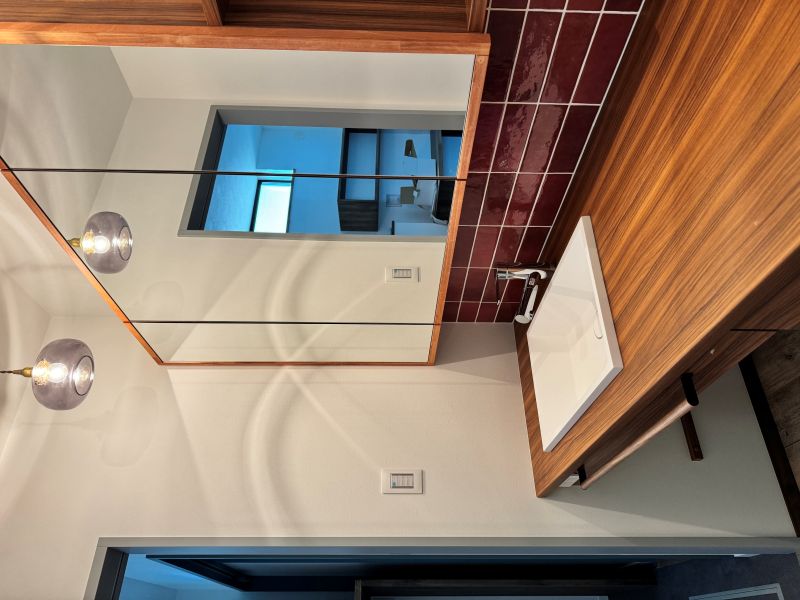 そして、もう一つの主役が「エンジ」色。BROOKでは珍しい大胆な色使いですが、造作洗面台のタイルに採用したことで、クラシックかつ洗練された空間が生まれました。