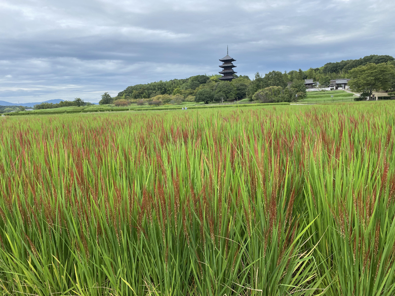 今朝、通勤途中に見つけた総社名物の赤米やオレンジのコスモス。