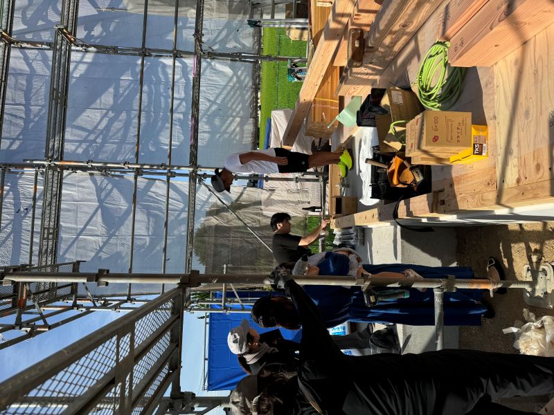 それぞれのポジションで黙々と柱を建て、梁を組んでいきます。