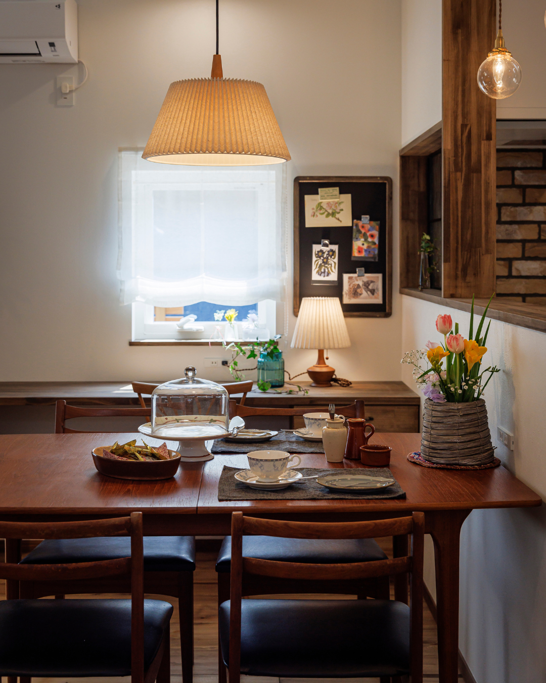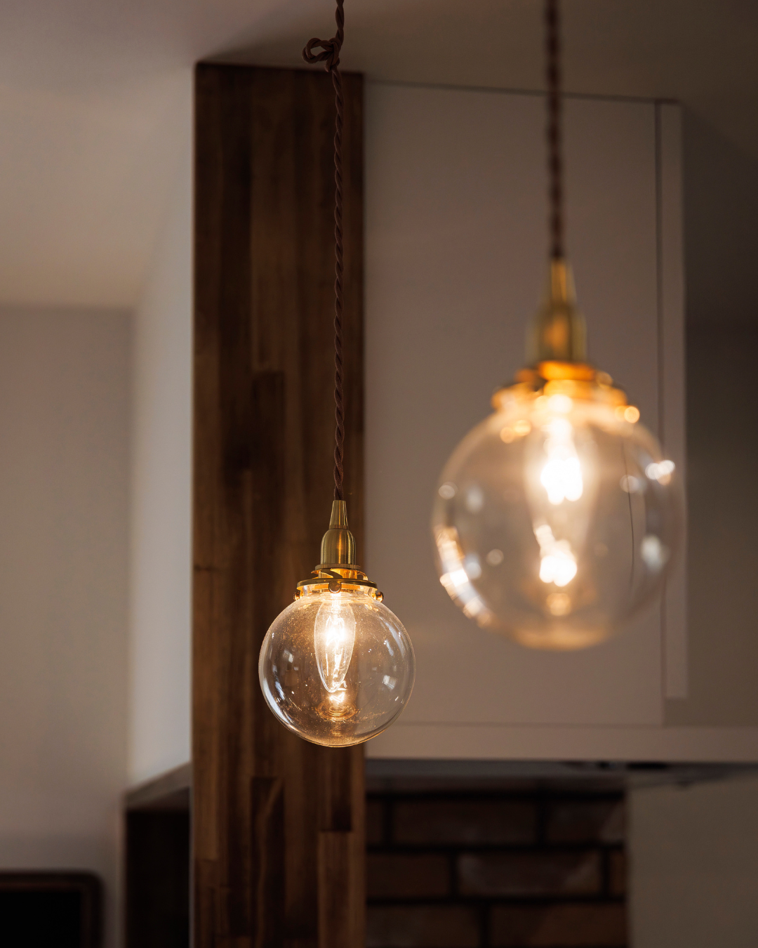 落ち着きのある色合いに着色した無垢材の床にガラスシェードをはじめとするおしゃれな照明、それにヴィンテージのダイニングテーブルなどを組合わせ、Mさま好みのインテリアを実現しました。