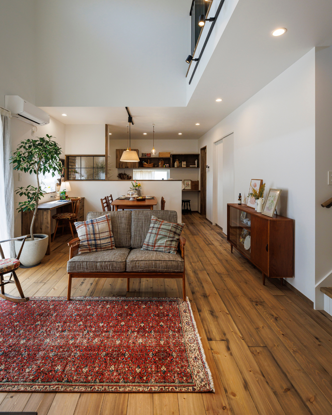 まずはなんといっても、吹き抜けを設けたこともあって、程よく開放的な空間に仕上がったリビング・ダイニング。