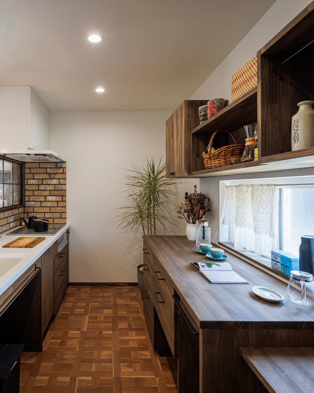 コンロ前にはBROOKではお馴染みのきれいな型板ガラスをはめ込んだ造作フレームをはじめ、油がはねてもへっちゃら!なレンガを壁面に採用。