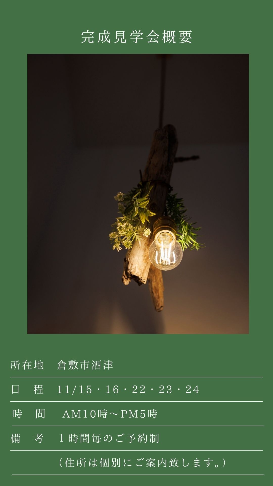 「倉敷市酒津のお家 見学希望です」と見学希望時間と合わせてお伝えください。