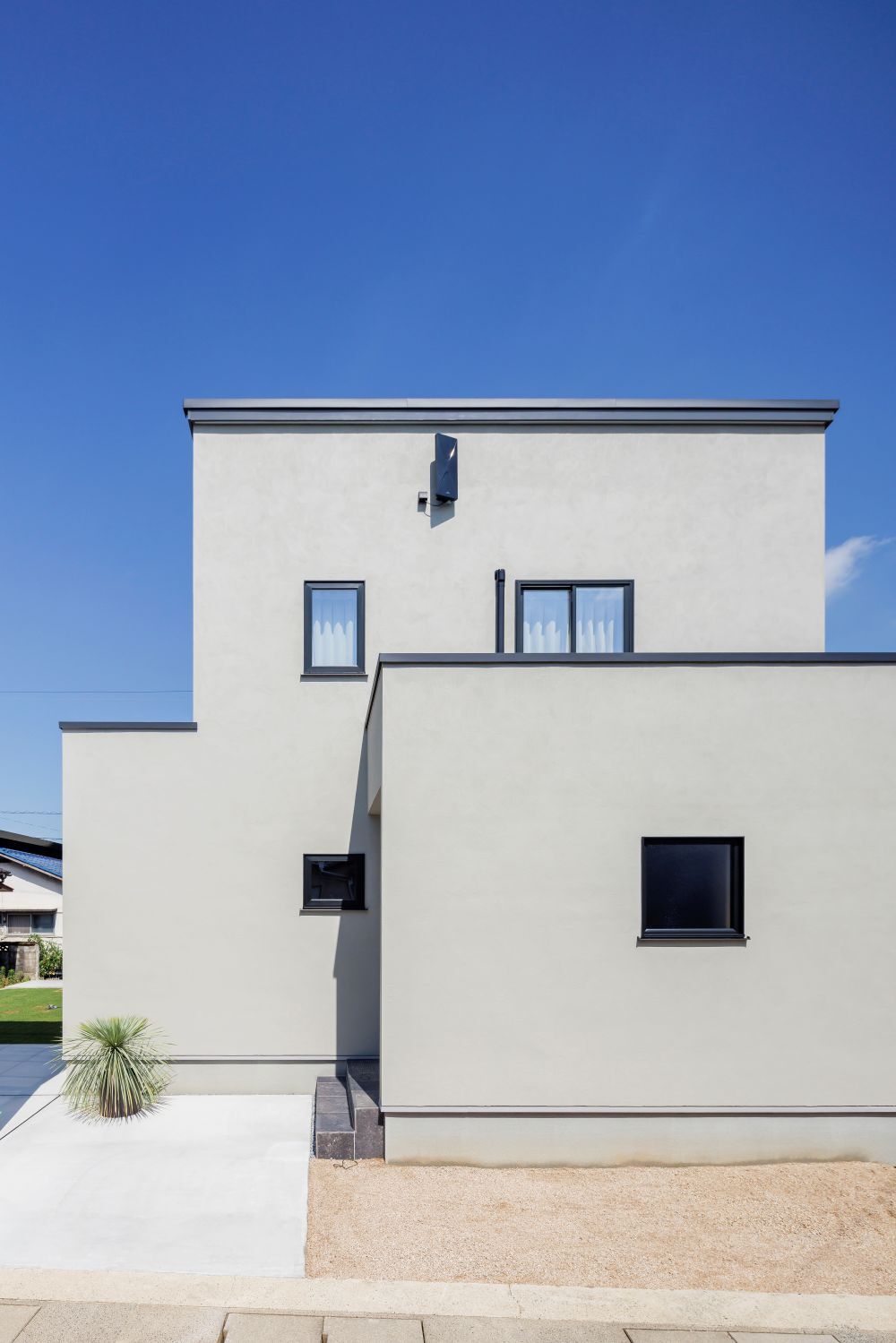 カーキとグレーを掛けわせたようなシックなカラーの塗り壁仕上げのI様邸。