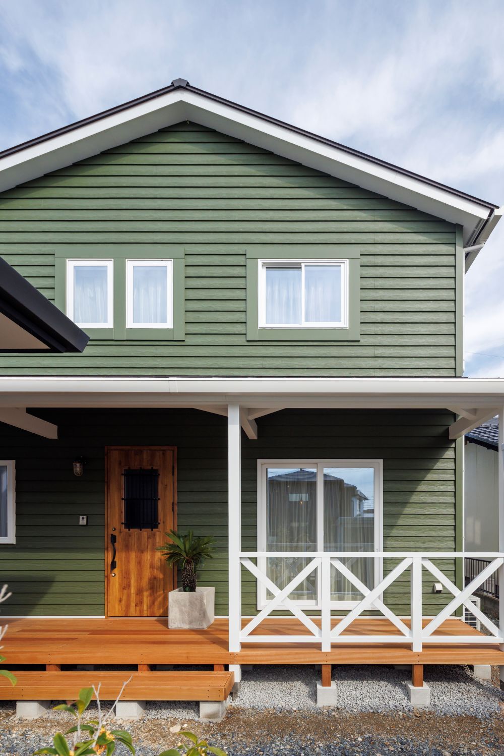 オリーブ色のに塗装されたウッドデッキはアイボリーの塗り壁との相性もバッチリ^^
