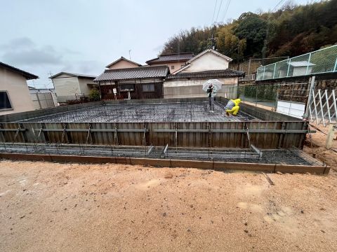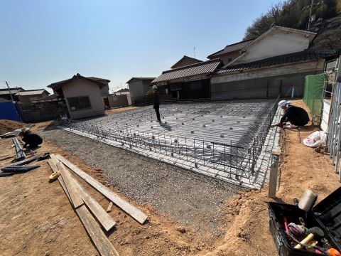立ち上がり部分のコンクリートを流し込むため、基礎周囲に型枠の設置を行っています。
