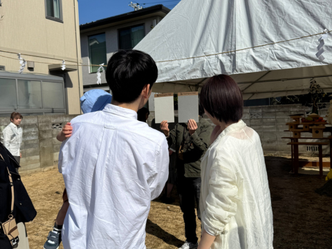 週間予報ではお天気がすぐれないということで心配だったのですが、とても良い天気にめぐまれて、予定通りT様の地鎮祭をおこなうことができました。ご両親にも参列いただき、厳かながら温かみのある地鎮祭になりました。
